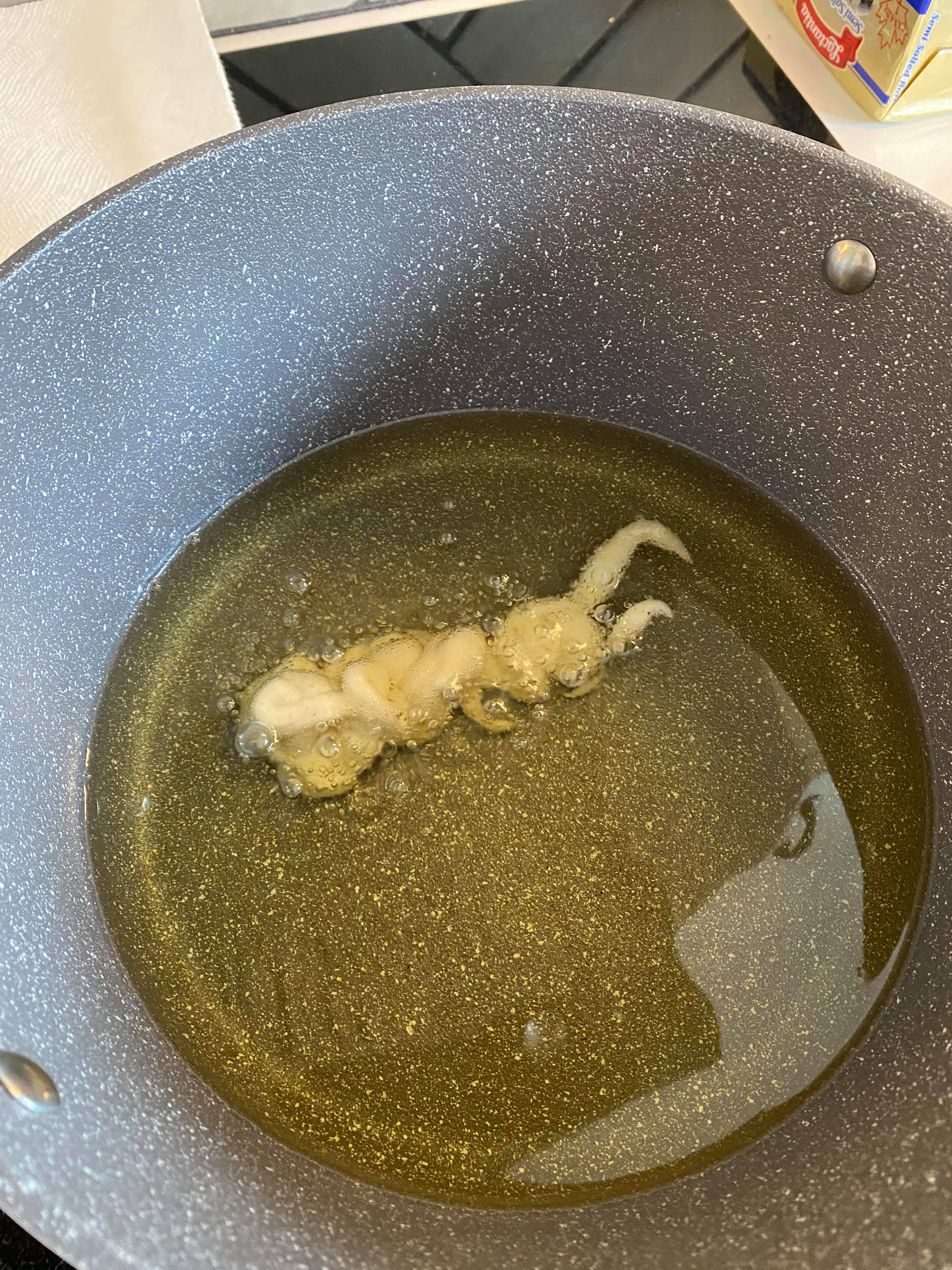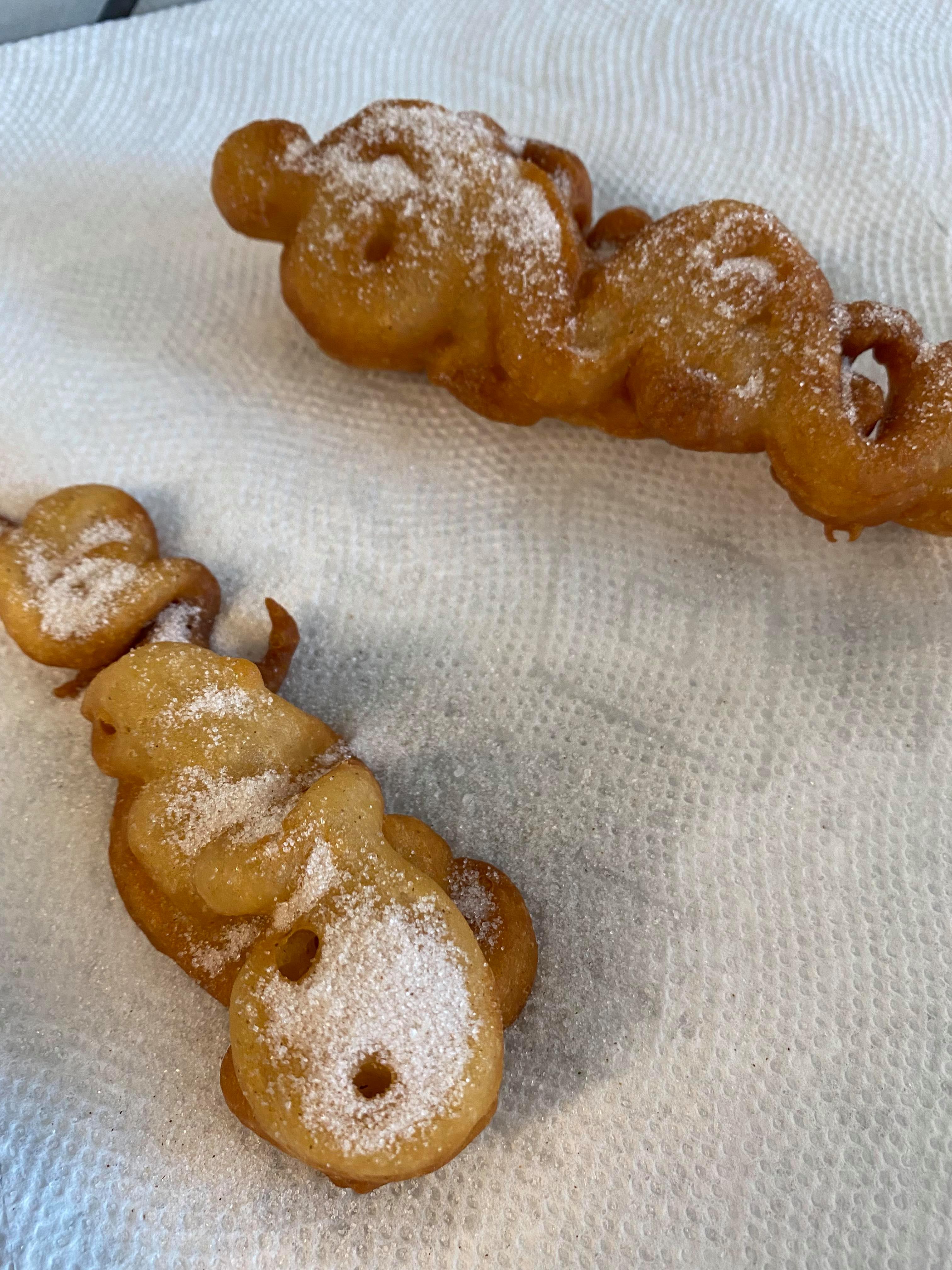 I have to admit, the recipe did not go as planned. I started putting all the ingredients together, everything was looking good, I only had to add a little extra flour to get the dough to thicken but we were doing good, everything was working out perfectly. I put my oil to heat, had my bag ready with the star tip to push those churros into the oil and that’s where I met my first snag. I am not sure if its because my star tip wasn’t big enough or my dough wasn’t thick enough but when I tried pushing the batter into the oil, it turned out like this: