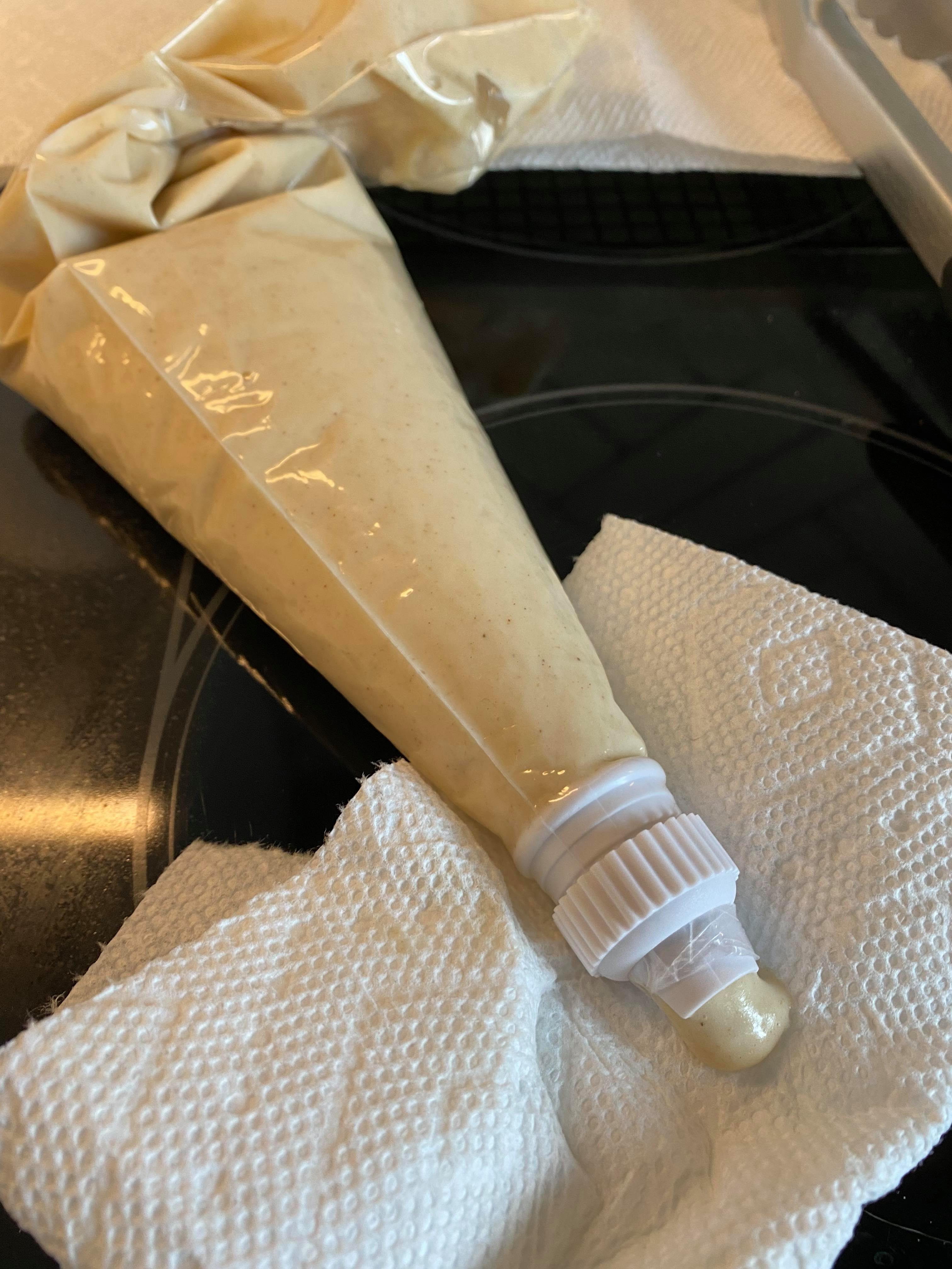 Step 4: Allow to cool for about 5 minutes; add one egg at a time, mixing in between as well as adding the vanilla extract. Mix until incorporated. Your dough should be thick and sticky with air pockets but not too thick that it won’t pass through the bag. If it is too thick, add milk (2 tbsp at a time) but if it is too thin add more flour, 2 tbsp at a time.