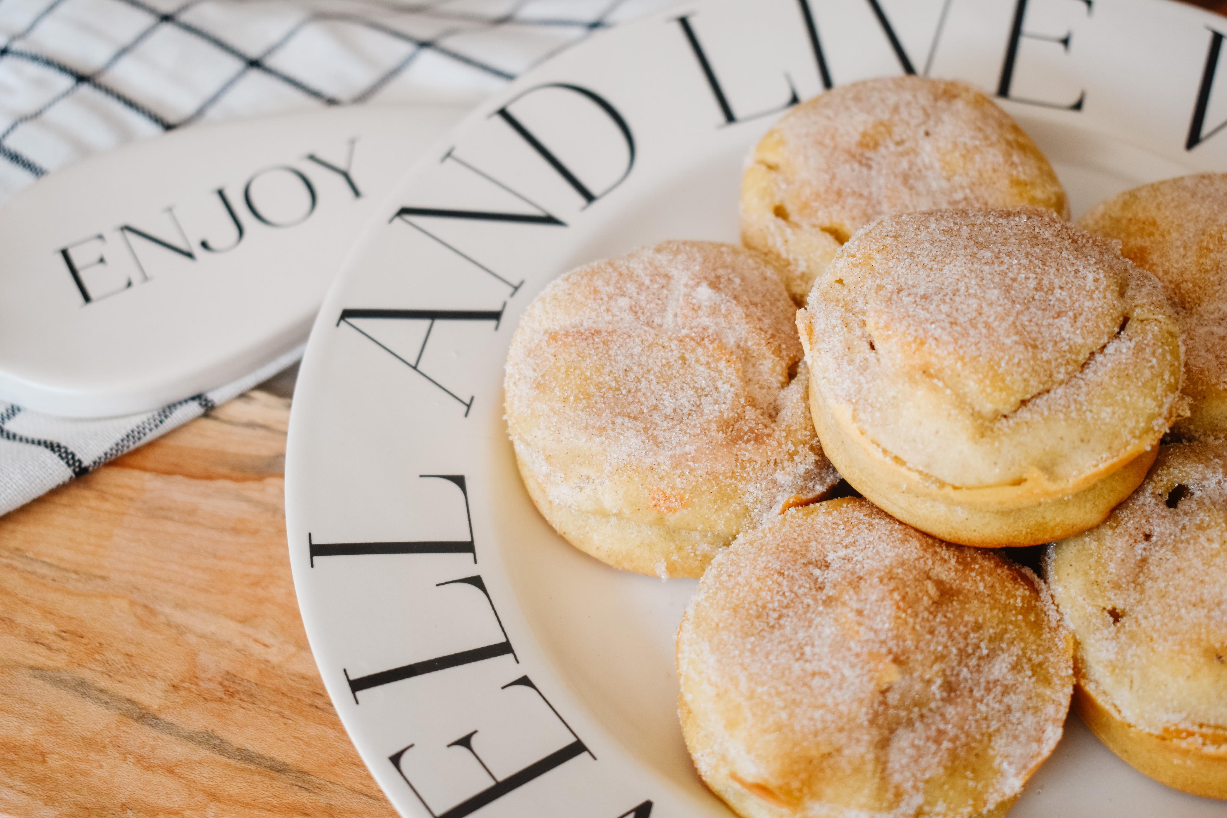Now because my recipe did not turn out quite how I expected, I just put my batter into a muffin pan, turned my oven on at 325 degrees and put them in for about 20 minutes (until they were golden brown). Once they cooled a little, I melted some butter, put it on top of each and added the cinnamon sugar mixture. Honestly these taste divine and I will definitely be making them again.